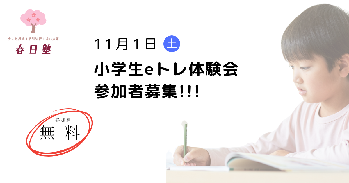 春日塾では、小学5・6年生を対象に eトレ体験会(参加無料) を開催します。普段の授業で使用している教材を実際に体験いただける機会です。ぜひお気軽にご参加ください。