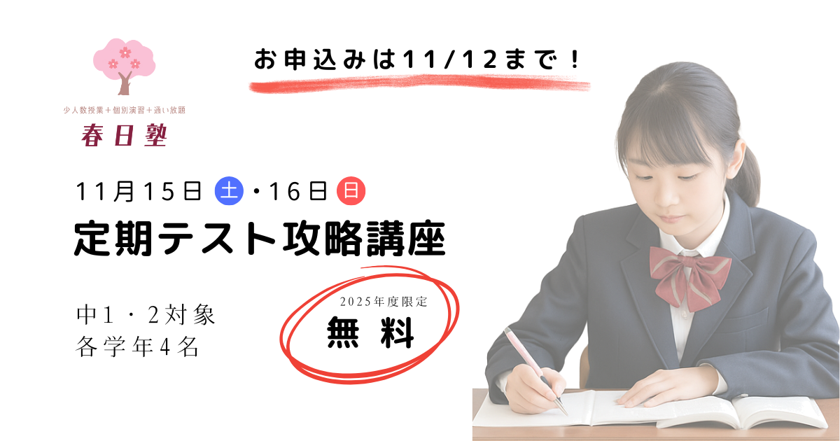 春日塾では、中学1・2年生を対象に “定期テスト攻略講座” を開催します。